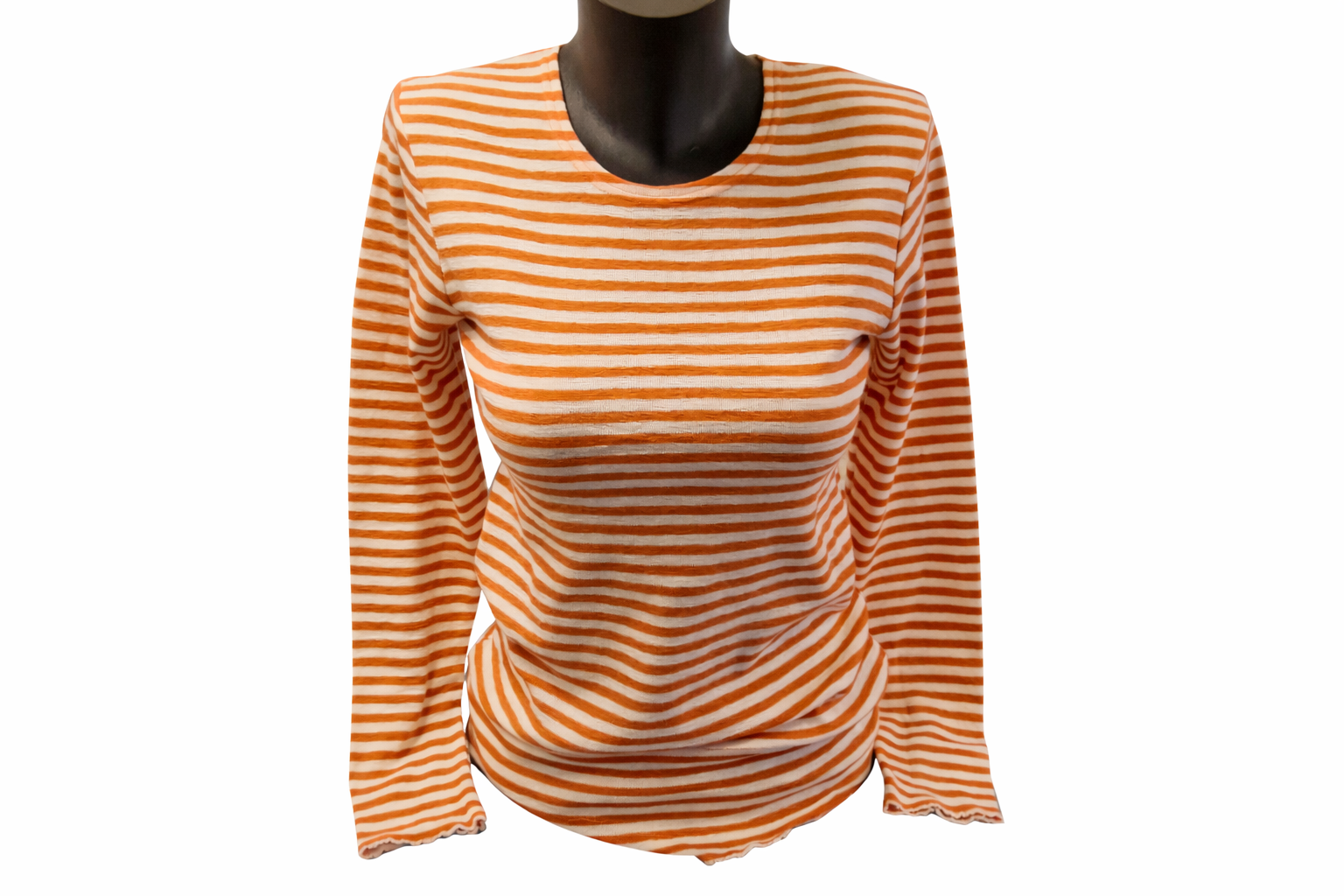 Denne stribede langærmede bluse fra By basics forener enkelt design med høj komfort. Blusen har et tidløst udtryk med fine horisontale striber i orange og hvid, der giver et friskt, men roligt look.